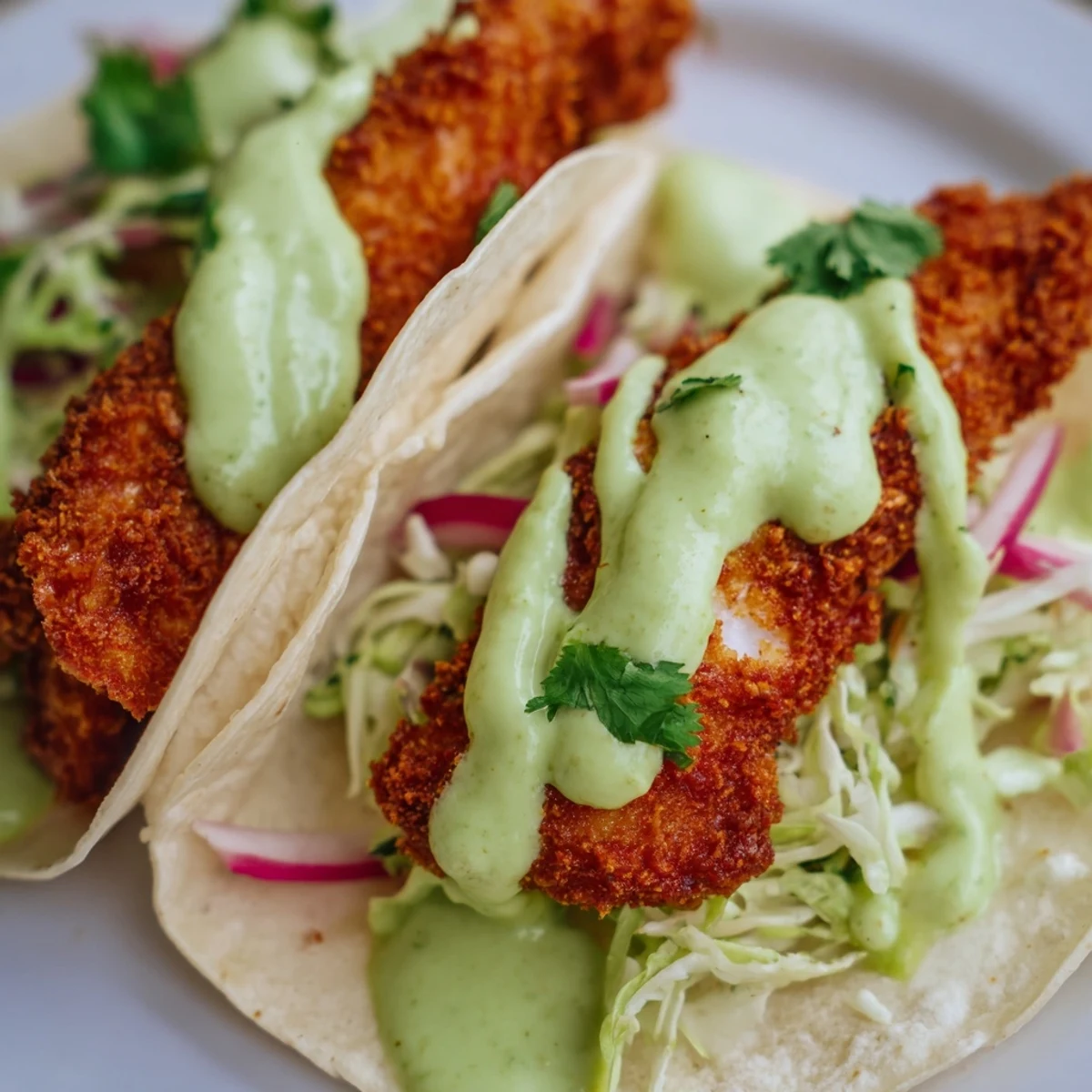- Place a portion of fried fish in each warm tortilla. Top generously with the slaw and drizzle with avocado crema. Add extra cilantro and lime wedges on the side.