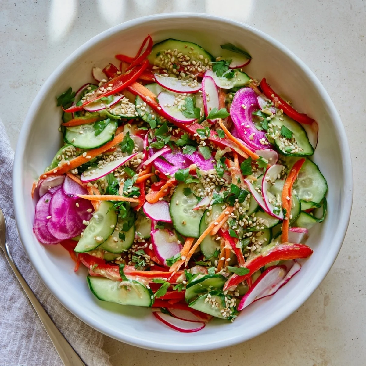 This vibrant Asian-inspired bowl brings together crisp cucumbers, julienned carrots, sliced bell peppers, radishes, scallions, and shredded red cabbage for maximum crunch and color. The creamy dressing combines mayonnaise and Greek yogurt with soy sauce, rice vinegar, toasted sesame oil, honey, fresh ginger, garlic, and optional sriracha for a rich, tangy finish with subtle heat. Toasted sesame seeds and fresh cilantro add the final touches. Ready in just 15 minutes with no cooking required, this refreshing bowl works perfectly as a light lunch or serves alongside grilled proteins for dinner.