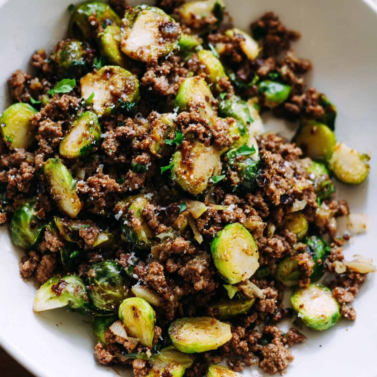 Simply brown the meat, sauté onion and garlic, then simmer the sprouts until tender-crisp. Cover to steam, then uncover for final caramelization. Garnish with fresh parsley and Parmesan for an easy low-carb dinner that feels substantial without being heavy.