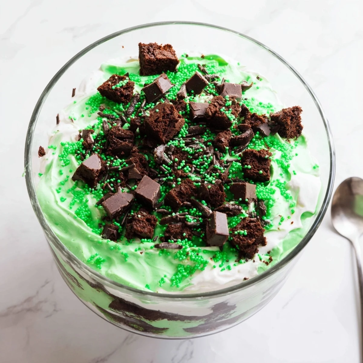 This festive layered dessert combines rich, fudgy chocolate brownie cubes with creamy pistachio pudding and lightly sweetened whipped cream. The vibrant green layers create a stunning presentation that captures the spirit of St Patricks Day celebrations.